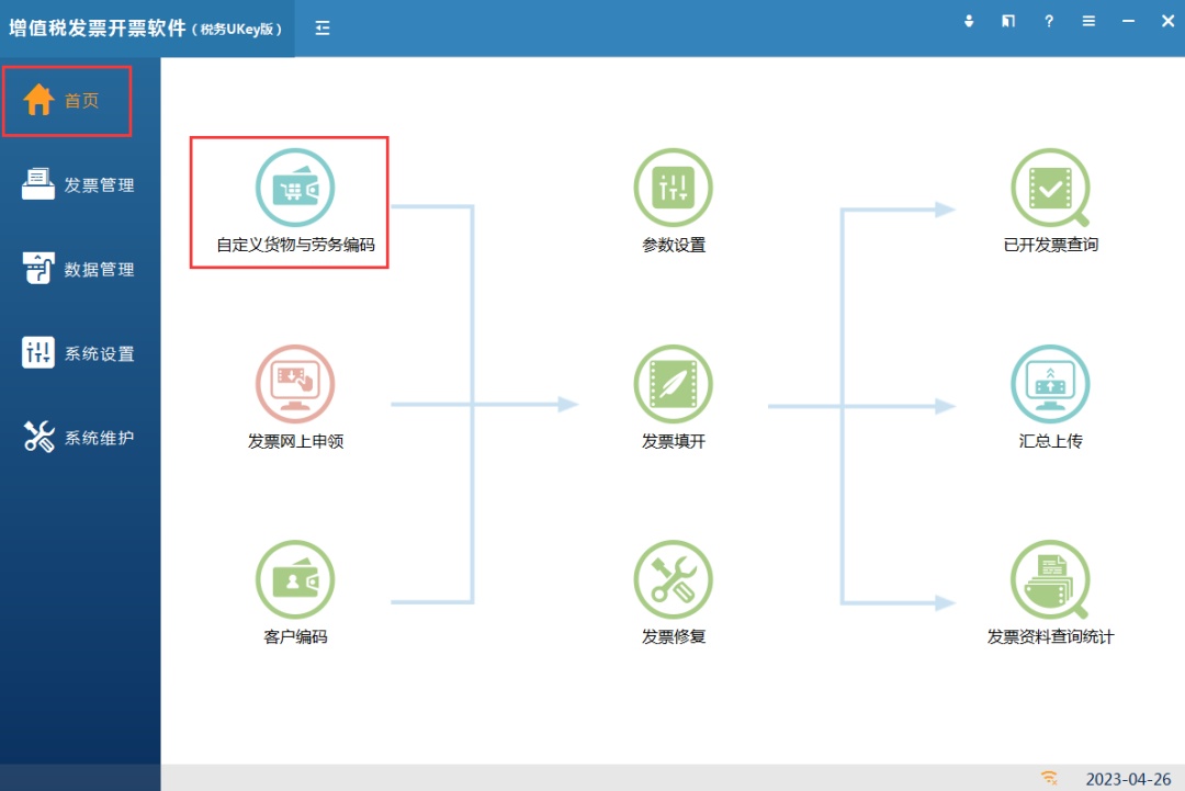 登录开票软件后,点击【首页】—【自定义货物与劳务编码】。
