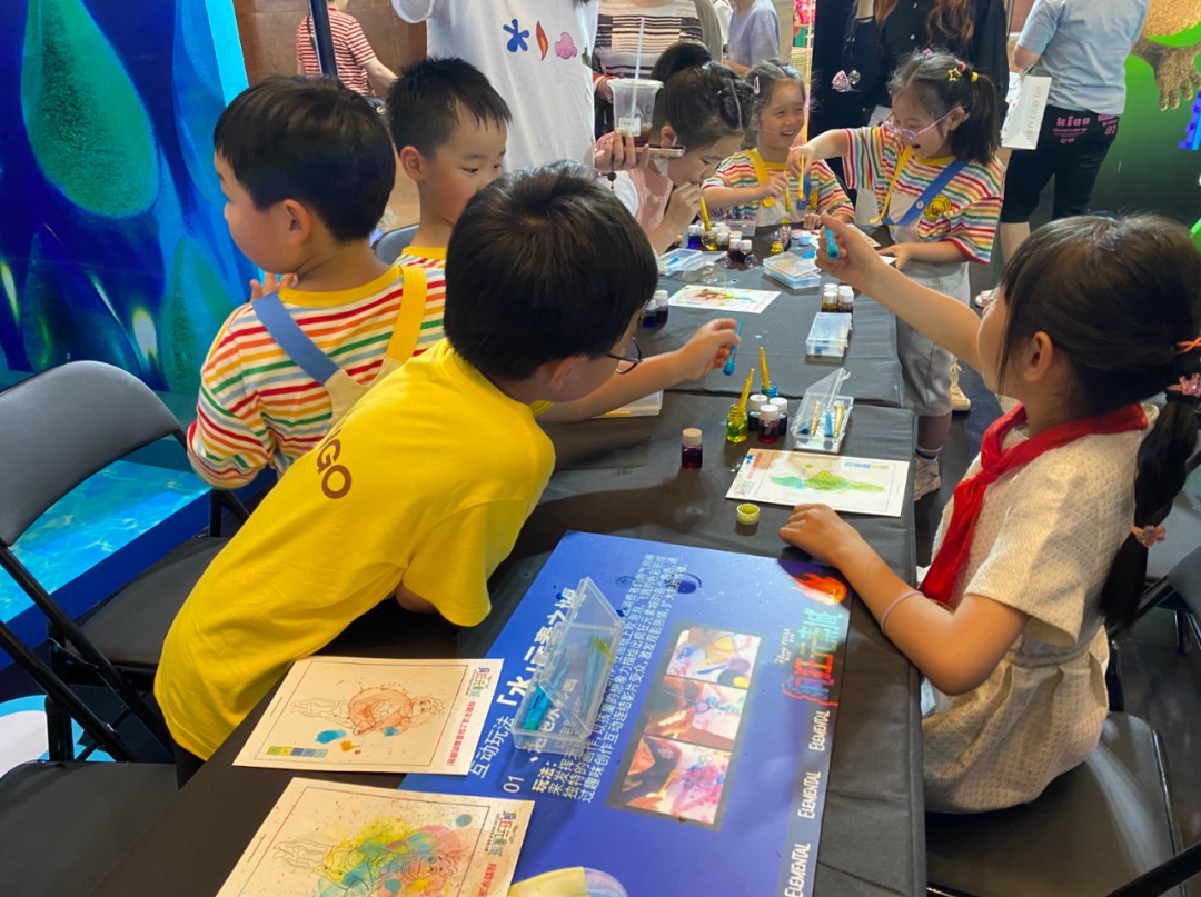 为配合主题展览,天安千树围绕电影中的风、火、水、土四大元素举办了限定手工workshop。电影中的卡通角色形象以泡泡水彩画、灯罩、绒绒云朵、卡通盆栽等等的艺术方式再现,益智有趣、创意无限。“我在玩泡泡画,画的是电影中的人物‘阿波’。”享受儿童节假期的三年级学生闻人好边画边说,“我用了两个颜色,一个黄色一个蓝色,蓝色跑到黄色里我还染出了绿色。”
