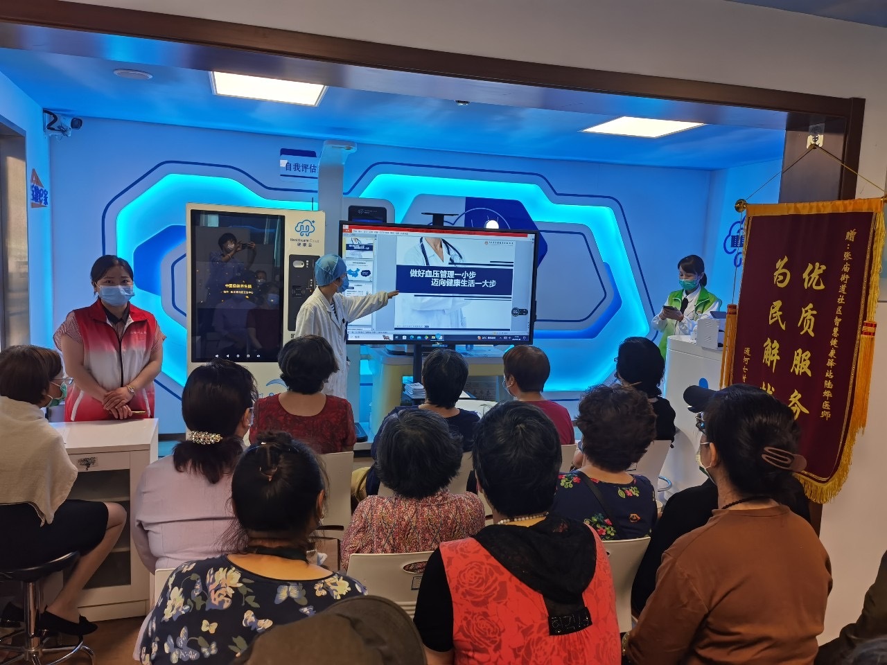 为帮助老年人重塑健康养生理念,提高健康生活质量,近日,宝山区张庙街道综合为老服务分中心特邀宝山区体育局社体部负责人邬维玉老师、长江路社区卫生服务中心冯群医生在共江路智慧健康驿站,为周边居民普及健身气功八段锦以及高血压的日常护理知识。