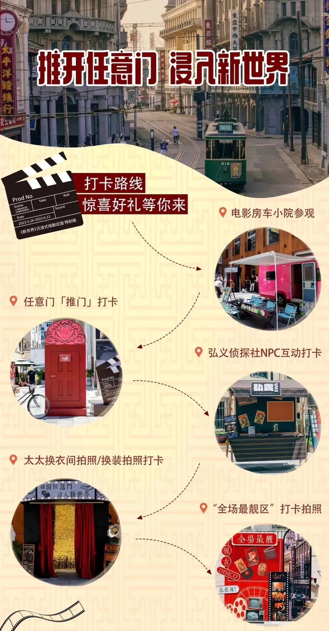 即日起至6月11日,上海影视乐园携手永乐汇,围绕沉浸式戏剧《新世界》打造主题快闪活动。一起走进安福路322号,打卡 “任意门”“弘义侦探社”“太太试衣间” “电影房车小院”,开启一场穿越时空的奇妙之旅吧!