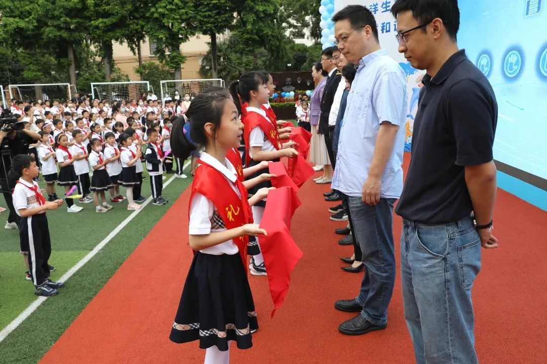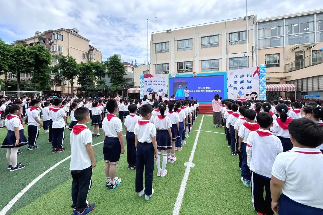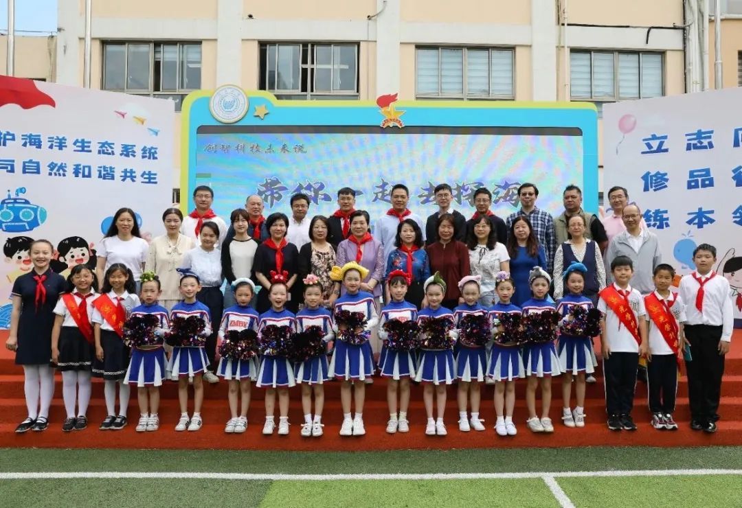 这次活动让孩子们大开眼界、受益匪浅,也在孩子们的心里播下了科学探究的种子。活动现场,由同济大学海洋与地球科学学院的三位专家为学生们授荣誉缎带,鼓励同学们成为小小海洋探索家。随后,同学们为到场嘉宾佩戴红领巾,并正式开启“创智科技未来说——带你一起去探海” 科普片的首映式,以及《我们的创新拓展日——“小小航海家”研学活动案例》授书仪式。