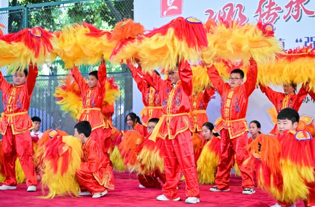 黄发红襟展雄姿,手狮盘旋声咆哮。舞台上,来自“非遗在校园”示范学校和马桥手狮舞传承基地校的13支学生队伍带来了振奋人心的狮舞表演。