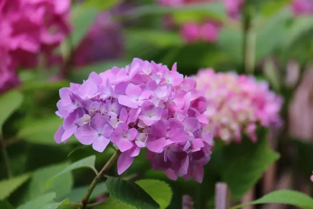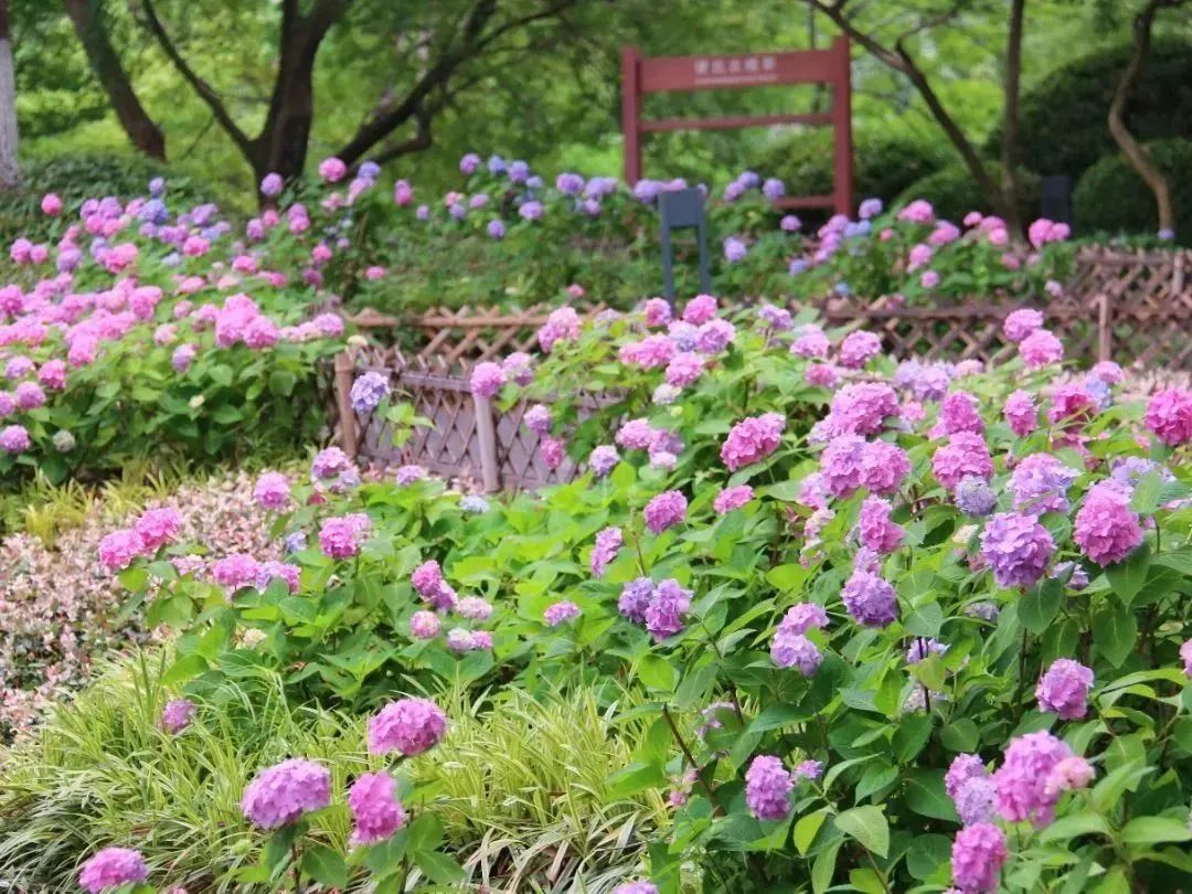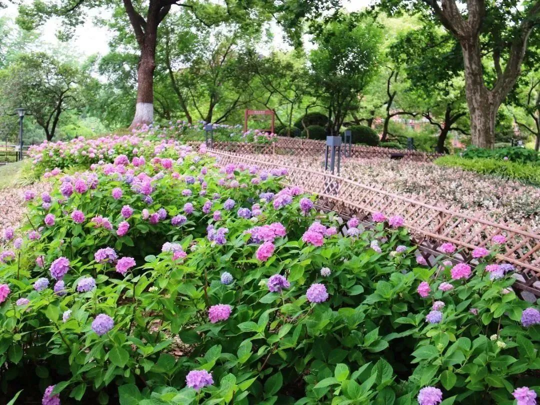 闸北公园的绣球集中种植于园内的尽悠岛,种植面积为124平方米。花圃以竹篱为栏,结合闸北公园中式园林风格,给人以山林野趣之美。