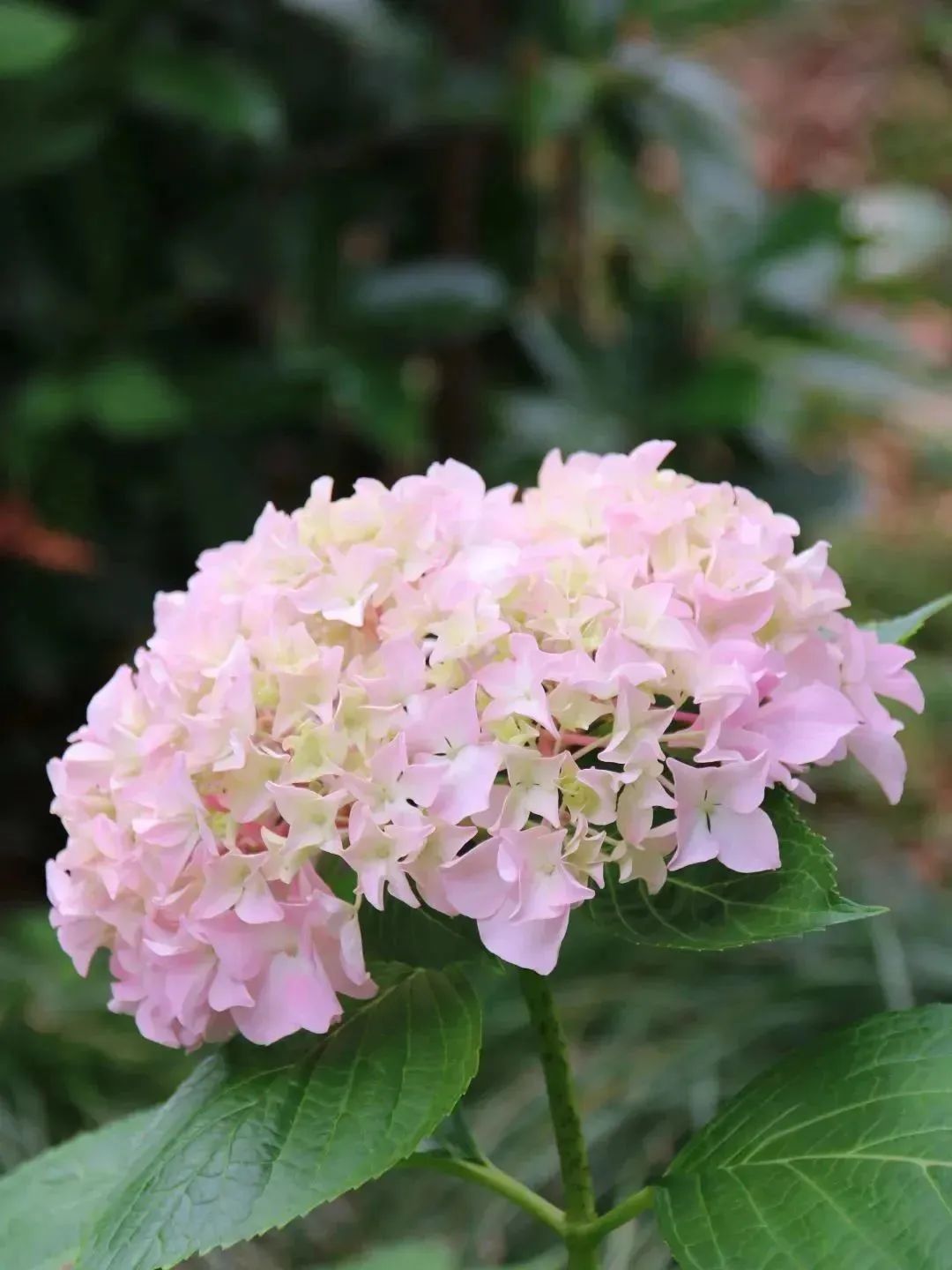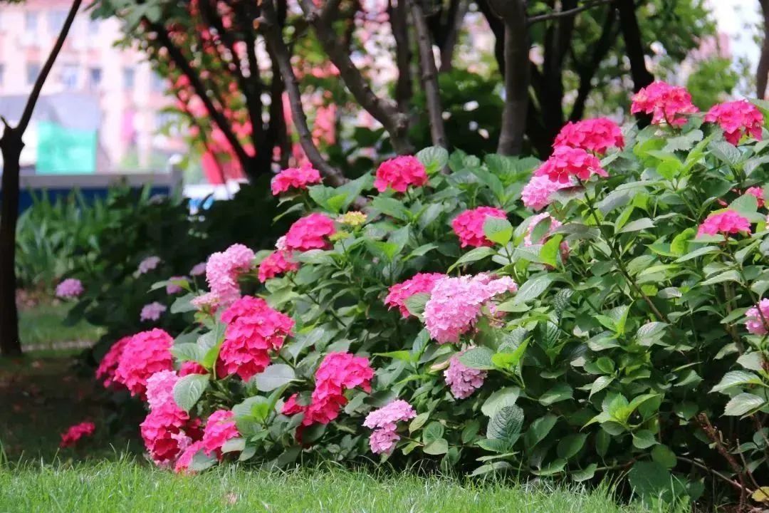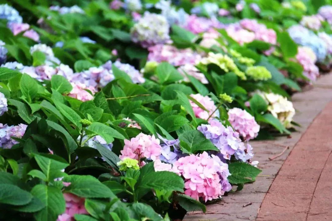 中兴公园的绣球根据园内地势栽植,整体分布为月牙形的花带,错落的观赏效果给人以清新之感。