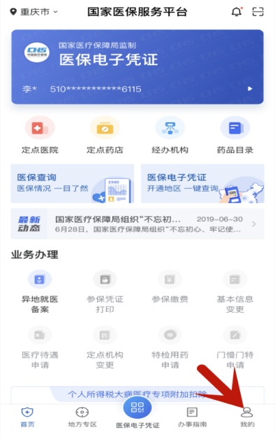 登陆“国家医保服务平台”app,进入主界面,点击右下角“我的”。