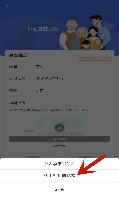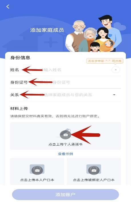 进入“添加家庭成员”界面,填写您小孩的“姓名”、 “身份证号”并选择“关系”——“子女”,点击“点击上传个人承诺书”。