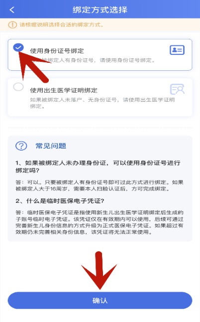进入“绑定方式选择”界面,选择“使用身份证号绑定”,点击“确认”。