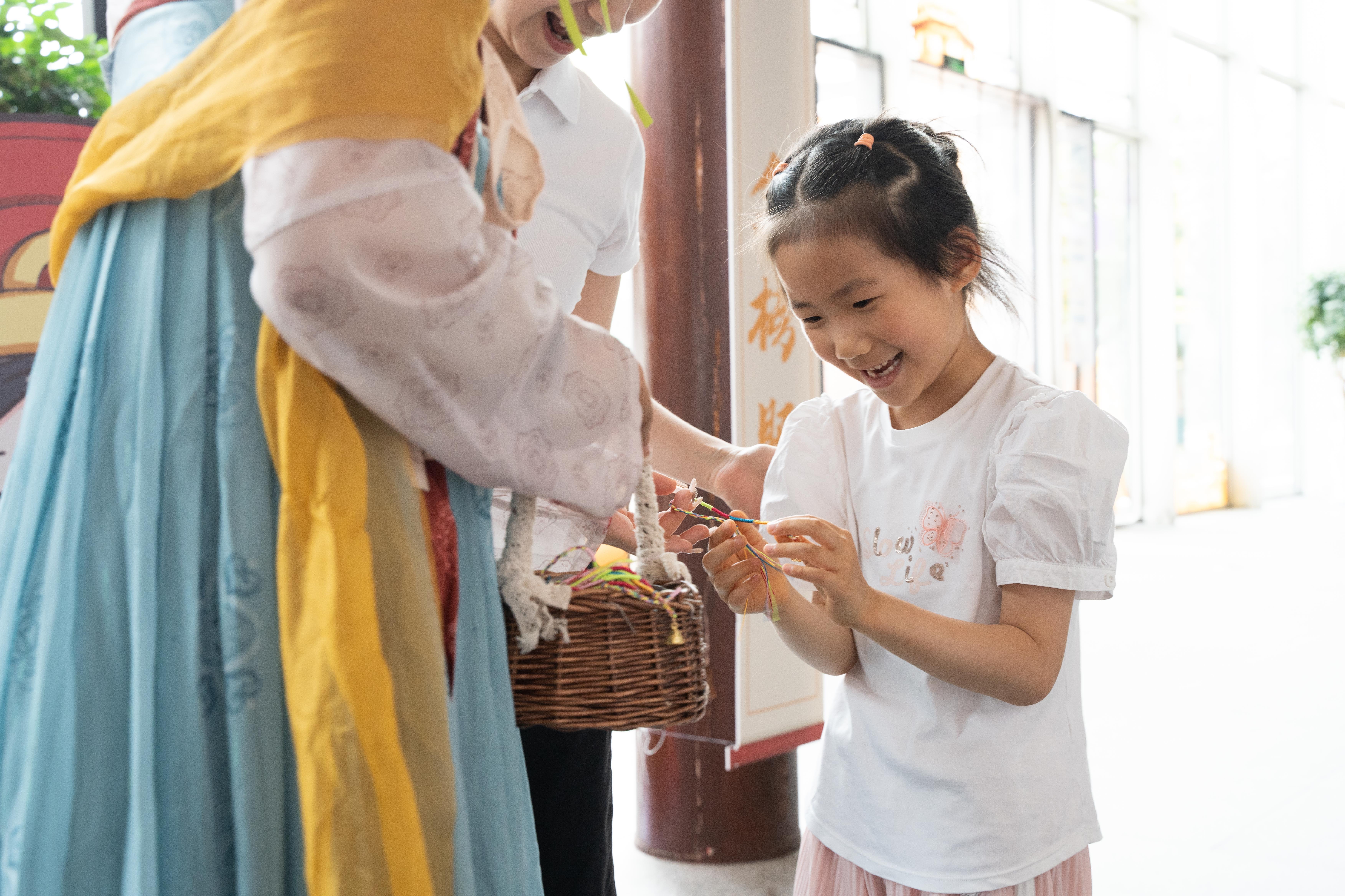 过去,人们在端午节会通过一系列具有仪式感的活动,寄托风调雨顺、远离灾病的美好祝愿,一般包括敬献清香、沐浴兰汤、画虎头额、诵读离骚等环节。今天,游客们在大报恩寺遗址景区内看到的端午古礼演绎,则是在吸纳传统文化精髓的基础上,融入了当今流行的互动舞蹈元素,通过避五毒、五色绳、挂香囊等环节,展示传统文化的内蕴和精髓。
