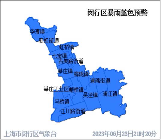 上海市闵行区气象台2023年6月23日21时20分发布暴雨蓝色预警信号: