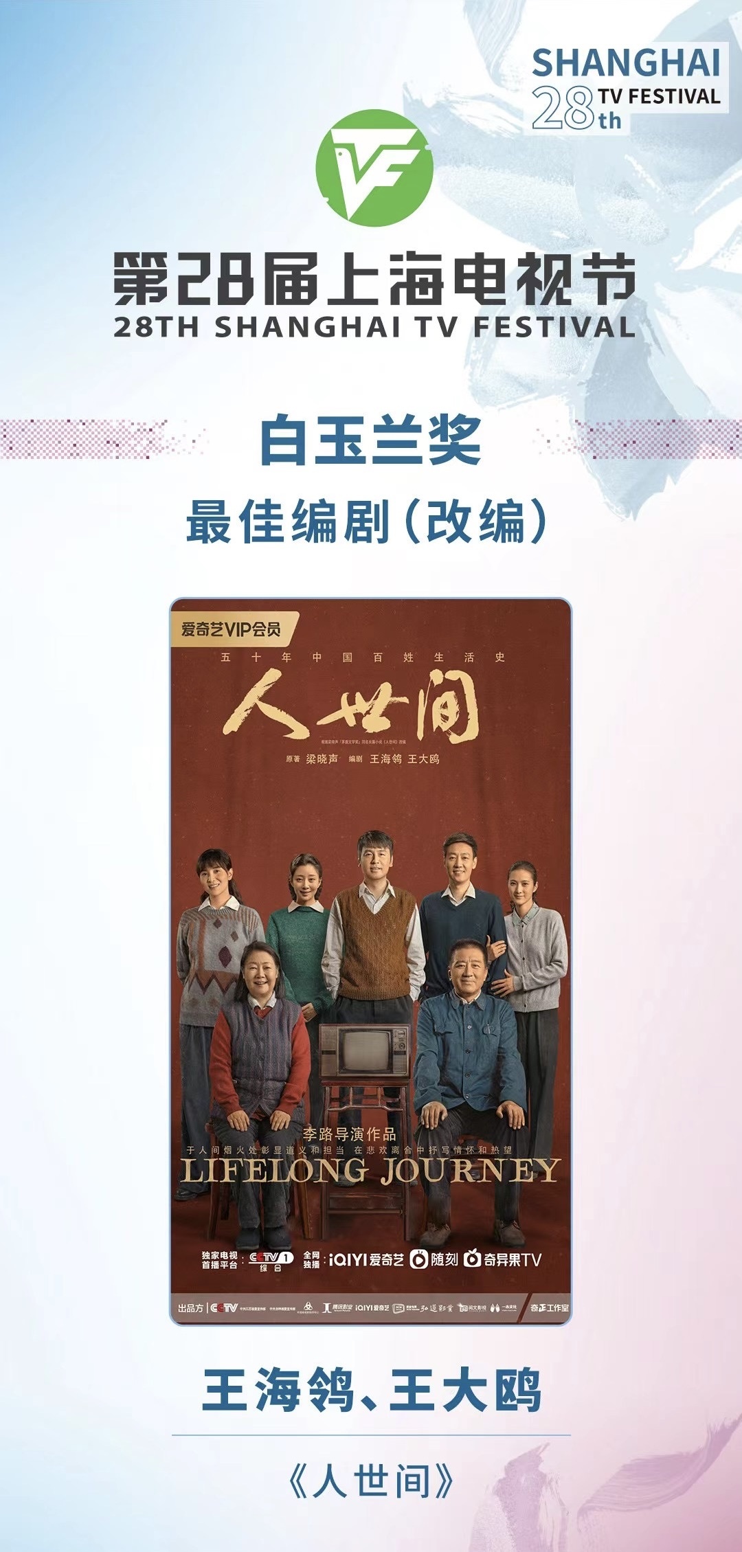 担任《人世间》编剧的王海鸰、王大鸥获白玉兰奖最佳编剧(改编)奖。王海鸰曾写出《中国式离婚》《新结婚时代》《大校的女儿》这样的国民好剧,对中国人的人情人性、伦理观念都有很深的理解。据悉,和一般的剧不同,《人世间》的剧本直到杀青前才算彻底完稿。怀着对作品真诚的喜爱,导演、编剧及主创团队在拍摄过程中一旦发现台词桥段有缺憾就会反复打磨剧本,力争好上加好。