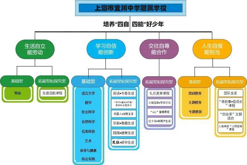 学生能力的全方位提升离不开“自能”课程的加持。宜川附校打造了三类“自能”课程,即基于国家课程,培养学生核心素养的基础型课程;基于基础型课程,兼顾学校传统与学生个性爱好的拓展型课程;立足于现实和未来需要,兼顾真实情境、经验重构和问题探究,解决学生“成长冲突”探究型课程,三类课程既相互关联,又保持一定独立性,实现了“融通”。
