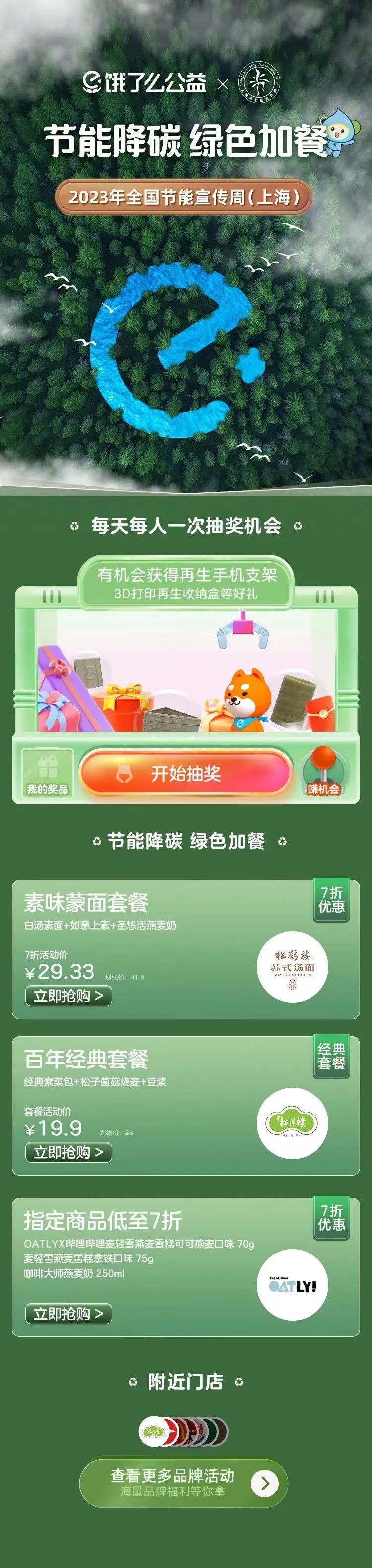 节能宣传周期间,为培养市民在外卖场景下的“低碳食物”消费行为,饿了么联合平台商户,以素食、植物类饮品、小份餐食为核心,打造“节能降碳 绿色加菜”的“绿色餐食”主题活动。7月10日至16日,在饿了么app搜索关键词“节能宣传周”即可进入活动页面,通过活动页抽奖将有机会获得再生材料3d打印多款周边,包括:再生手机支架、再生收纳盒和再生pp笔筒等;通过下单素食、植物类饮品等,支持绿色加餐,助力节能降碳;通过下单符合低碳的“小份餐”还将获取碳积分(减碳量),并可兑换相关权益;同时,节能降碳“猜答案免单”活动将于7月12日开启,市民可收获免单的开心,更可以收获获得知识的开心。