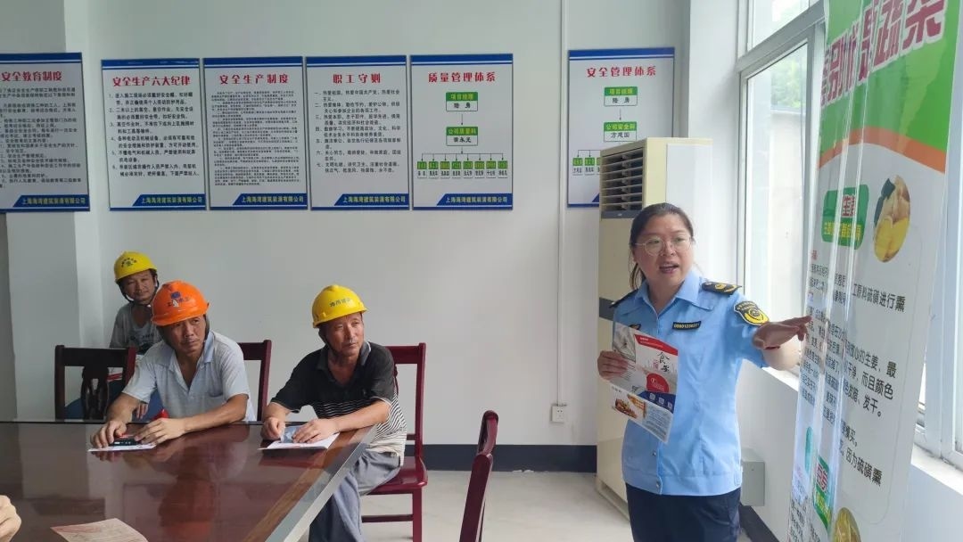 在树京智能科技(上海)有限公司建筑工地,执法人员开展了食品安全知识宣传,现场发放宣传手册50余份,并向工人们科普保健食品如何购买、外出就餐需要注意什么等实用性内容。不少工人们表示,平时没有时间了解食品安全知识,这次的宣传对他们很有帮助。