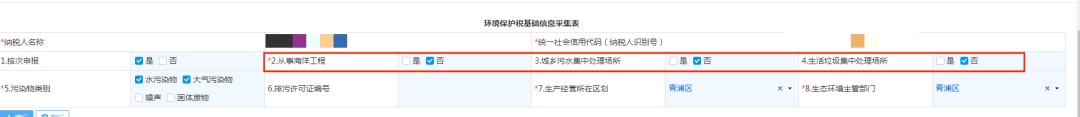 根据是否存在海洋工程,是否从事城乡污水集中处理场所、生活垃圾集中处理场所的实际情况进行选择,勾选“是”或“否”。