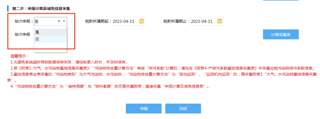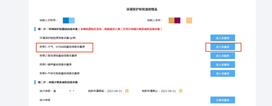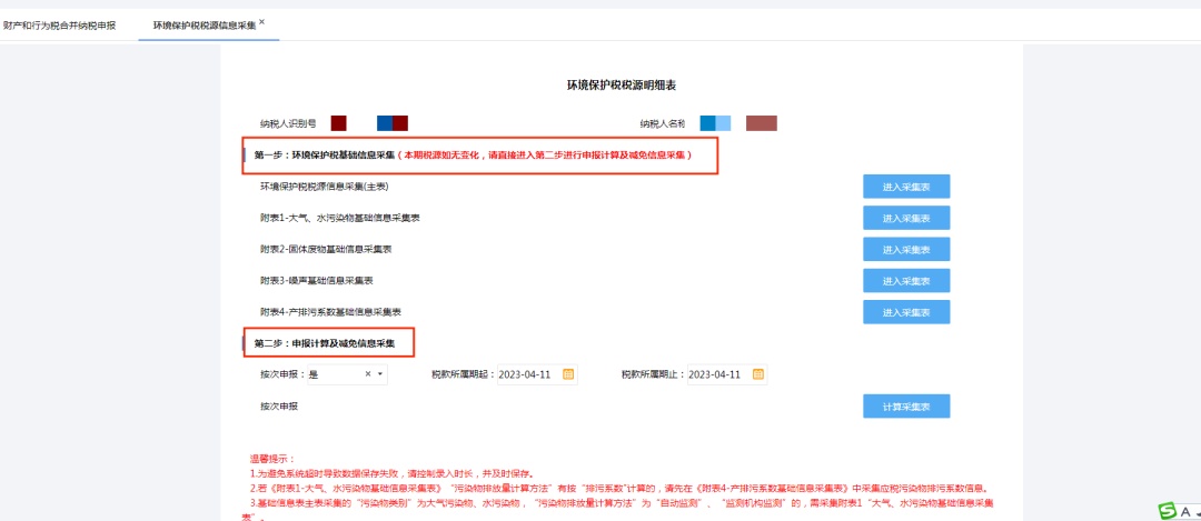 如果已采集过环保税基础信息,且不需要新增、修改,可直接进入第二步:申报计算及减免信息采集。