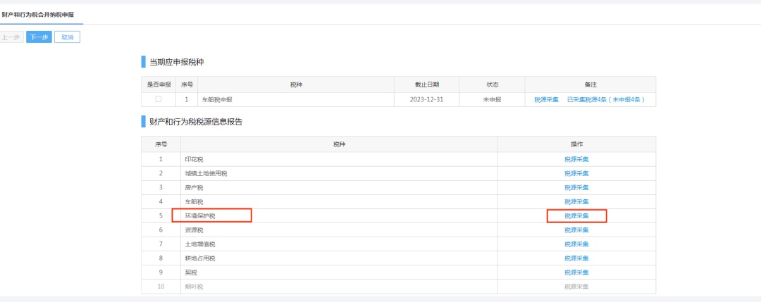 最后,点击【保存】,返回【环境保护税税源信息采集】界面,则系统出现一行申报采集记录,点击下方【申报】即返回到合并申报界面,勾选【环境保护税】,点击【下一步】,点击【申报】即完成环境保护税申报。