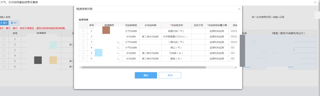 点击【增行】按钮,系统弹窗显示已采集的大气、水污染类别的主表基础信息,选择某一条或多条记录后点击【确定】,进入大气、水污染基础信息采集表填写页面。
