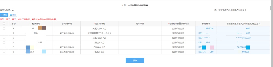 按照环境保护税税源信息采集(主表)与《排污许可证》上的相应信息填写,填写完毕,点击【确定】后跳转至【大气、水污染物基础信息采集表】,点击保存,返回到【基础信息采集表】。