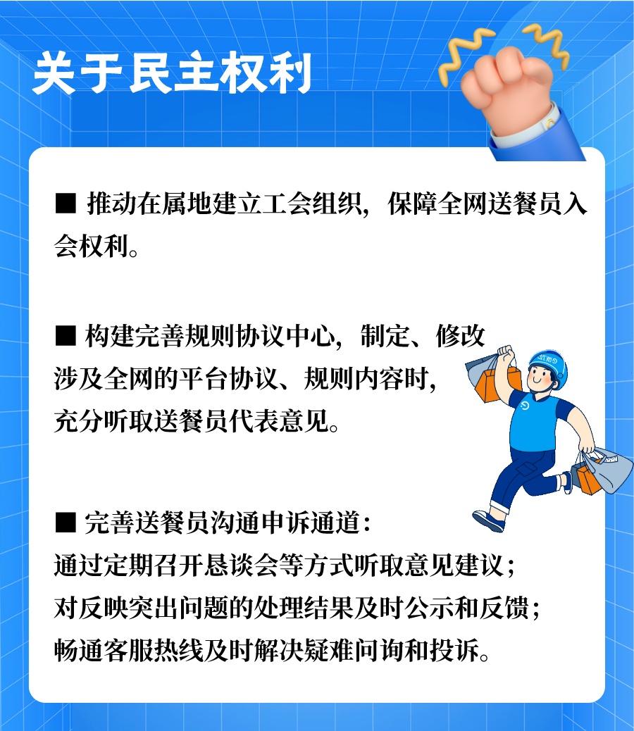 截至目前,饿了么、美团(上海)、叮咚、盒马(中国)等网约送餐平台企业建立全网或地区总部民主协商制度,圆通、中通、申通、韵达、极兔、德邦等总部在沪快递企业建立全网协商协调制度。