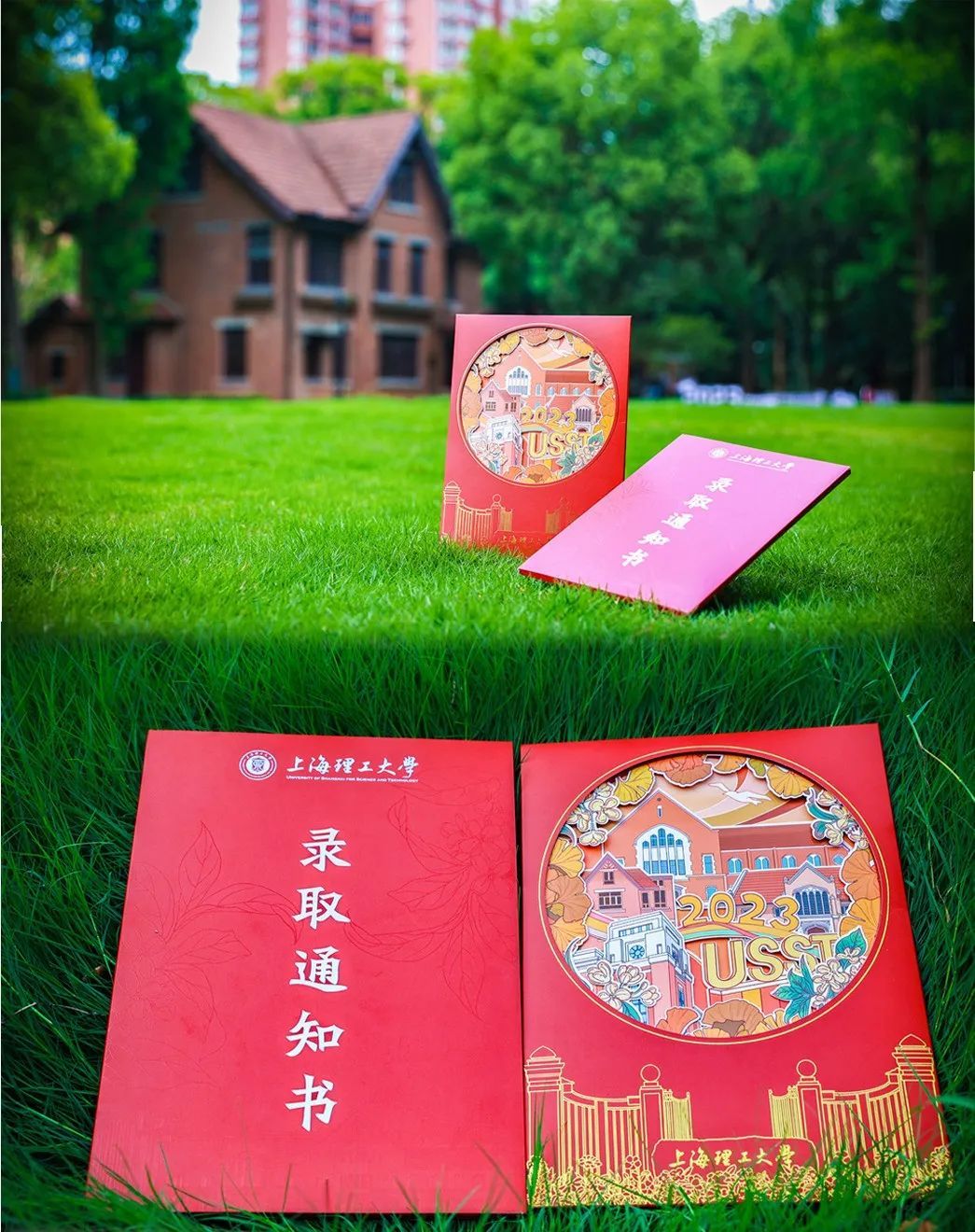 上海理工大学录取通知书的封面设计运用了学校的标志性建筑以及桂花的线条。内一页使用上海理工大学“信义勤爱 思学志远”校训做成可以拆下的书签;内二页是校园建筑装饰的立体纸雕,有综合楼、大礼堂、音乐堂、桂花、银杏叶等上理元素。下方对学子敞开的学校大门,象征着对2023级新生们的热烈欢迎。