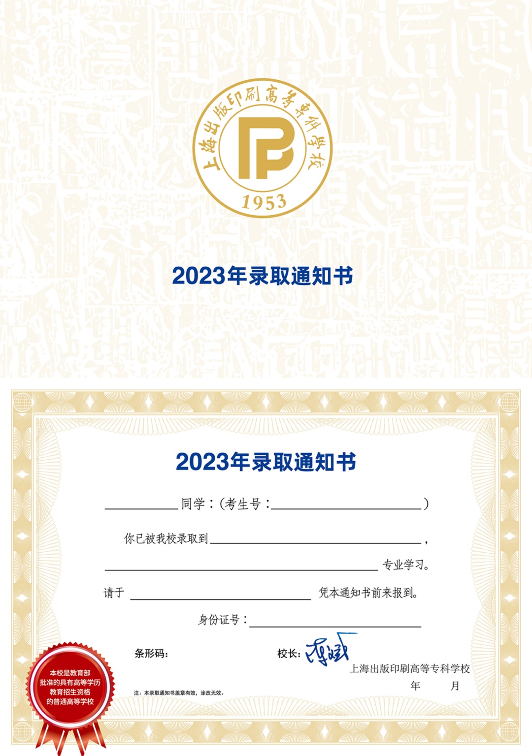 上海出版印刷高等专科学校录取通知书上,学校标志性的纹理图样和学校徽章十分醒目,涵盖学校发展历史、发展定位和发展目标,凸显 “工文艺融汇、编印发贯通、教学做互动、产学研互动”的办学理念。