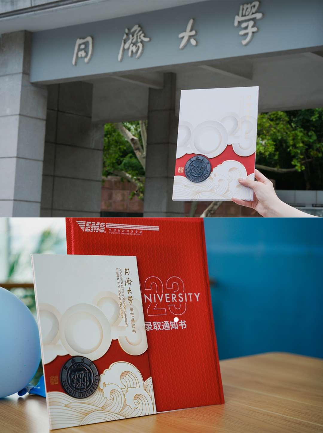 同济大学录取通知书继续沿用“乘风破浪”的设计主题,通知书主要使用可再生资源制作,红彤彤的包装袋是学校送上的第一份祝福,寓意“大展‘红’图”。封套正面是一枚同济大学校标冰箱贴,取下后还能看到烫金描边版的校标象征“继往,开来”。在录取通知书的护封上,凸印着校训“同舟共济”。