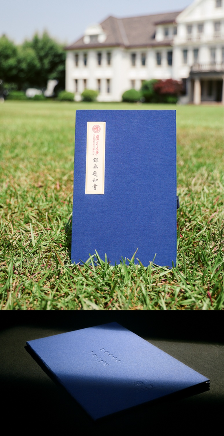 复旦大学录取通知书以复旦科技成果——可保存千年以上的开化纸为载体,封面色调为“复旦蓝”,封底为复旦校训“博学而笃志,切问而近思”。整体设计采取古典风格,正文雅致小楷为复旦大学公共卫生学院教授高翔所书,正文落款印章为复旦大学特聘专家、著名鸟虫篆刻家徐谷甫所刻,通知书内页上印制的复旦实景版画系复旦大学特聘专家、著名版画家倪建明所创作,力图呈现“科学、人文、艺术”的有机结合。