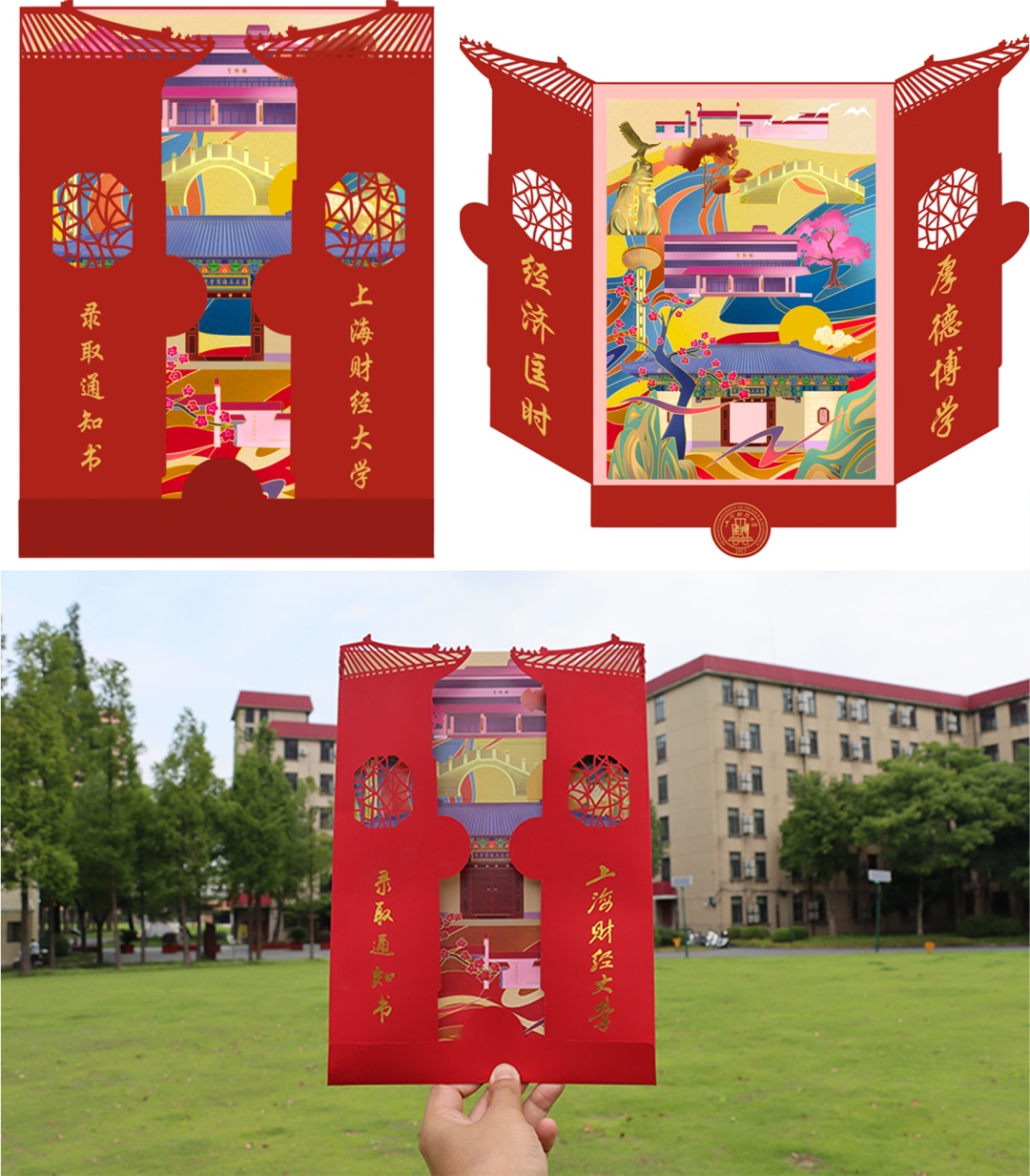 上海财经大学录取通知书以“国立上海商学院”的老校门为外壳原型。内页采用国风画法手绘立牌,以老校门为中心,串联起国定大门、春晖桥、“志在云天”雄鹰雕塑等上财经典地标,再用粉白樱花与盛放梅林进行点缀。翻折90度后,可以竖立形成上财立牌场景,再翻开便是心“芯”相印的录取通知书,用一纸信书寄一生 “厚德博学”的传承与担当。