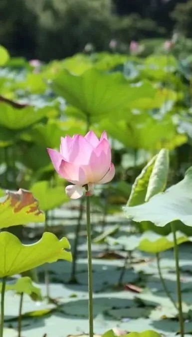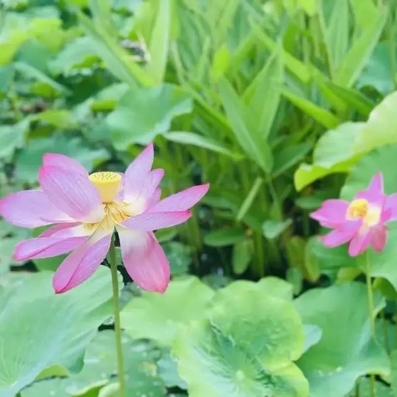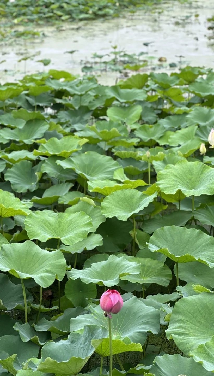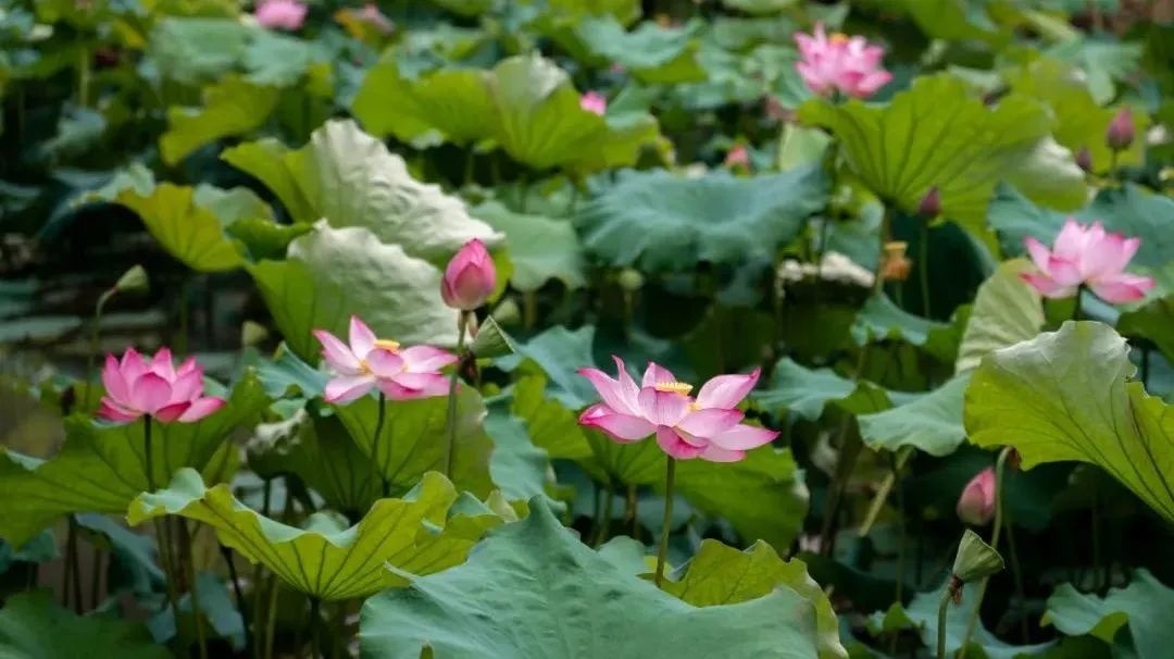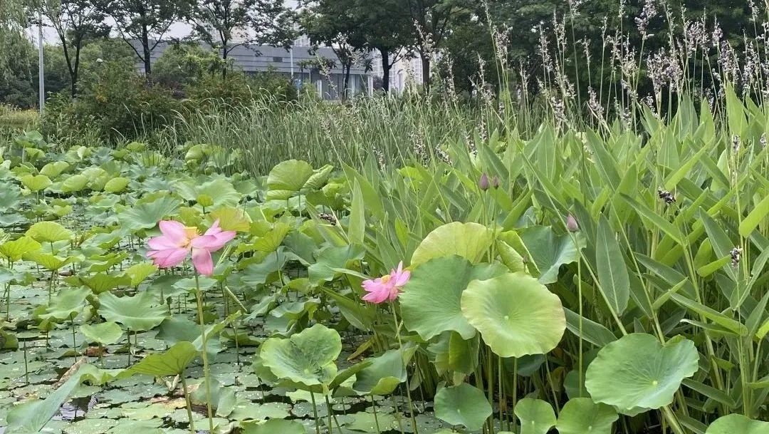 来到金山新城公园,映入眼帘的是一幅荷叶田田的画卷,荷花池里水波荡漾,荷叶铺满水面,灵动又清新。而在大片的绿意中,几抹粉色身影吸引了人们的眼球,“万绿丛中一点红”的意境油然而生。