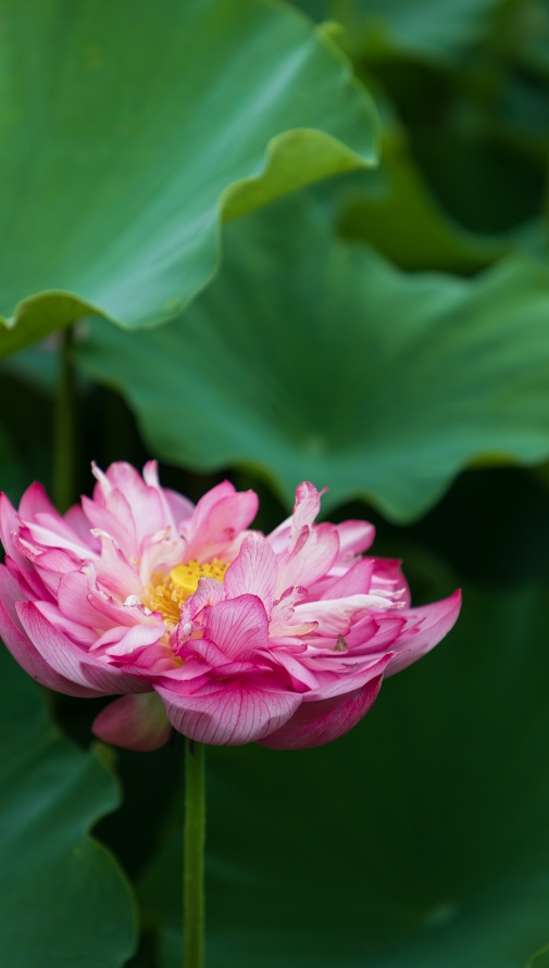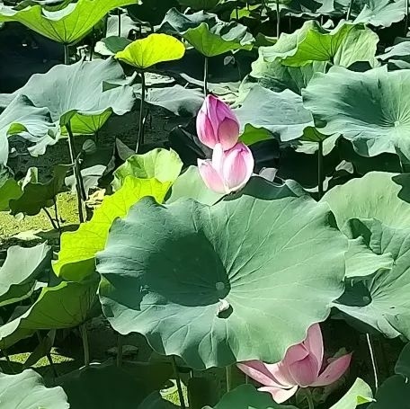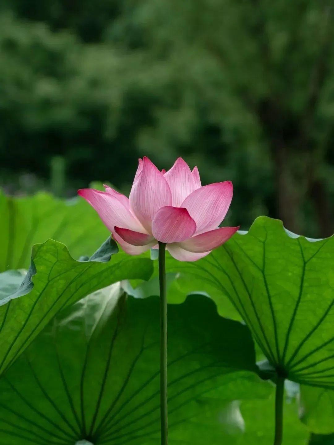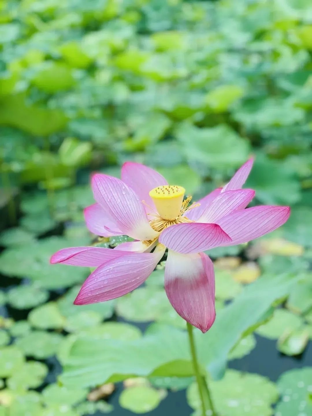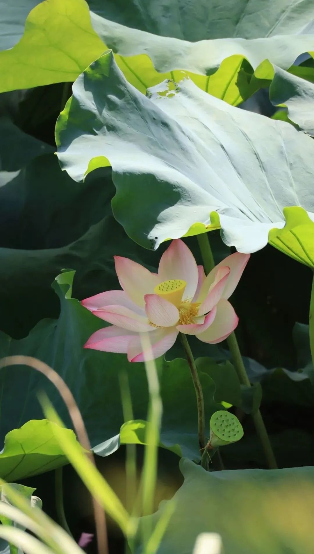 来到金山新城公园,映入眼帘的是一幅荷叶田田的画卷,荷花池里水波荡漾,荷叶铺满水面,灵动又清新。而在大片的绿意中,几抹粉色身影吸引了人们的眼球,“万绿丛中一点红”的意境油然而生。