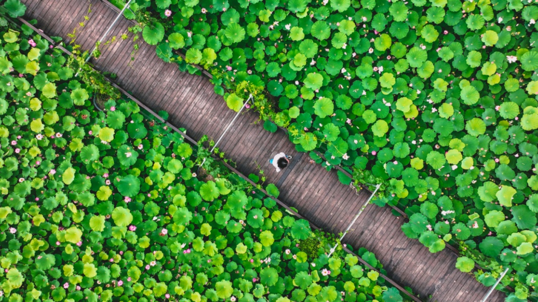 赏荷、饮茶、骑行……在这里,你也可以过上悠然的田园生活。在花开海上生态园的秋景园内,荷花长势喜人,满塘夏意。苍翠茂盛的荷叶犹如小伞似的,铺满了整个湖面。一朵朵粉荷次第盛开,摇曳动人。