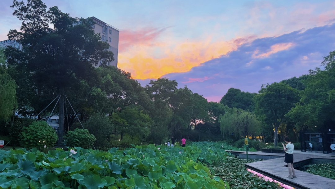 傍晚,来到前京大道绿地,池塘中荷叶荷花影影绰绰,站在木桥上,荷花的香气从四周袭来,神清气爽,心情舒畅。在晚风的吹拂下,看着碧绿的荷叶和天边的晚霞相映成辉,诗情画意在不经意间流转。