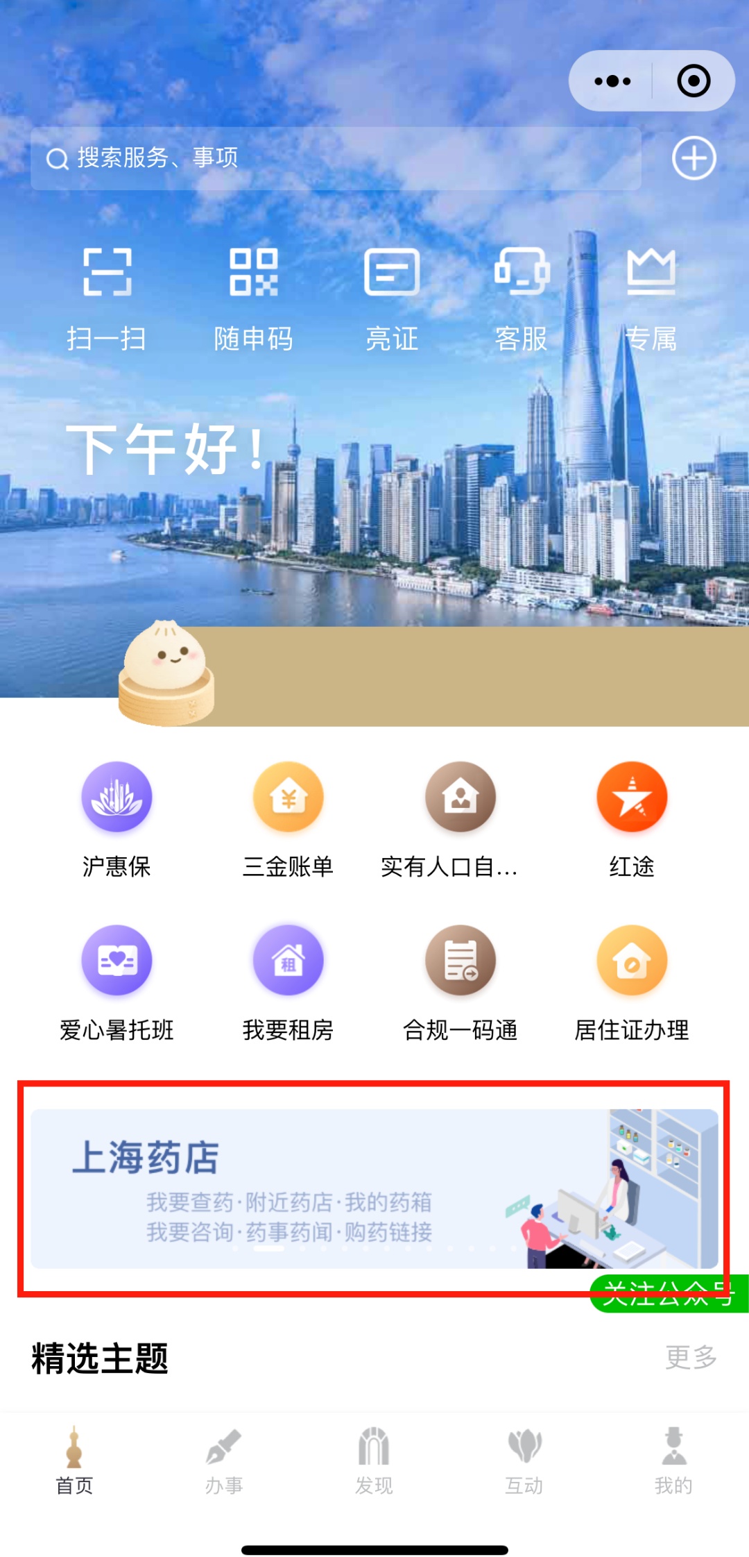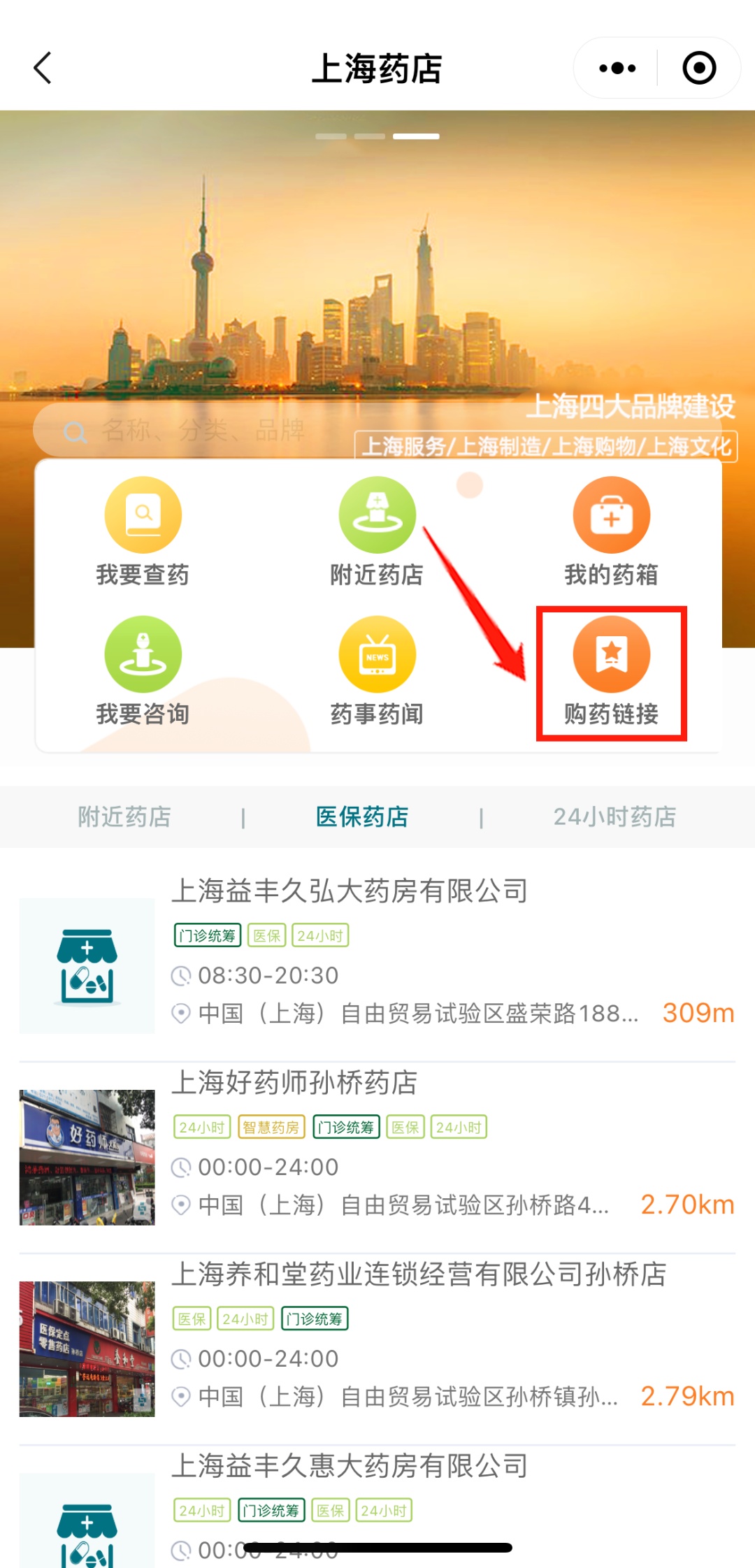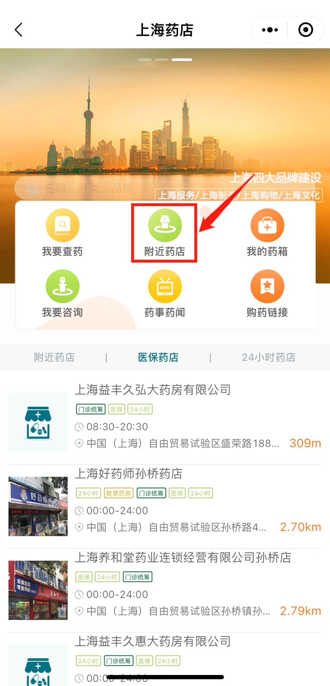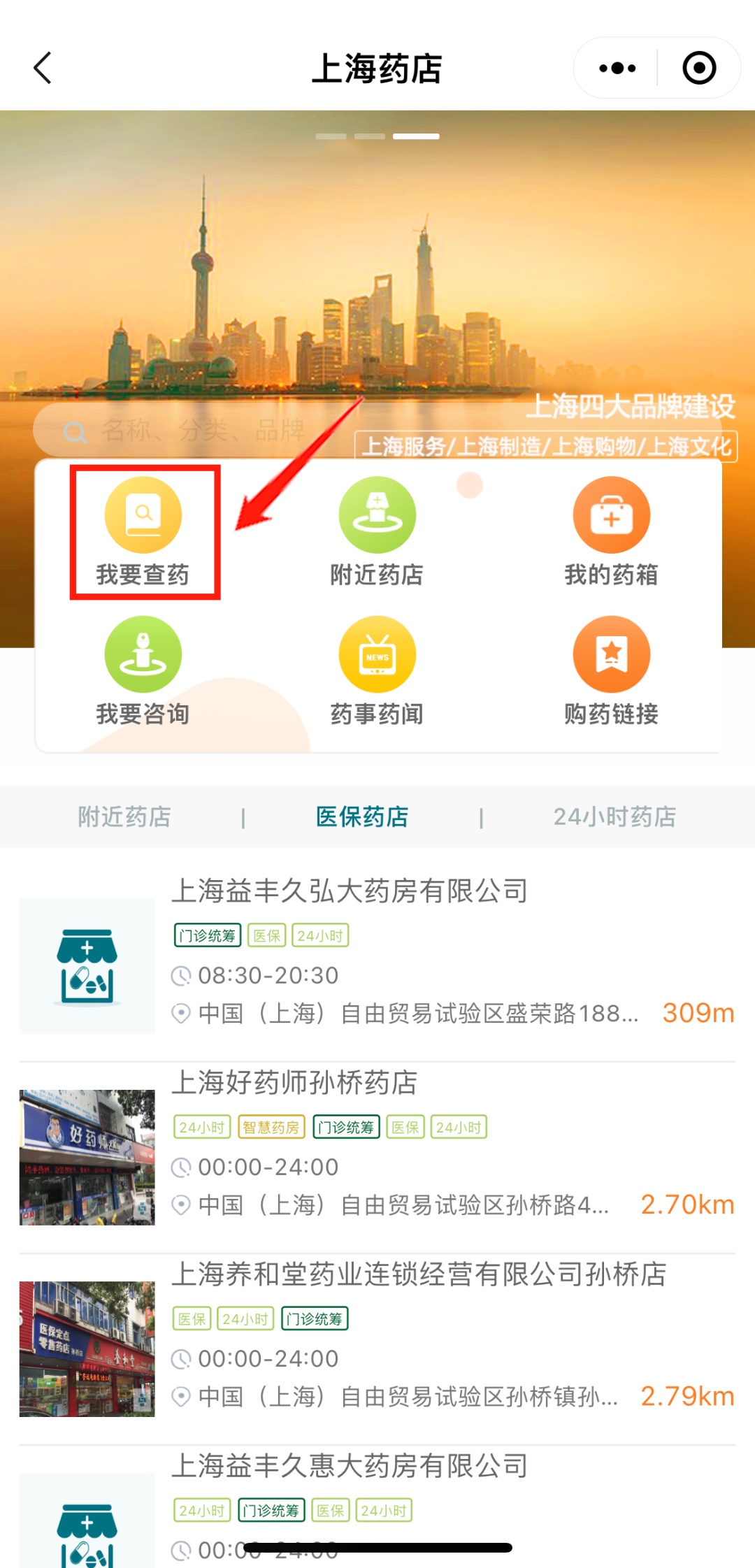 “随申办”首页中部轮播图找到“上海药店”点击进入专栏(←此处小程序可点击)。