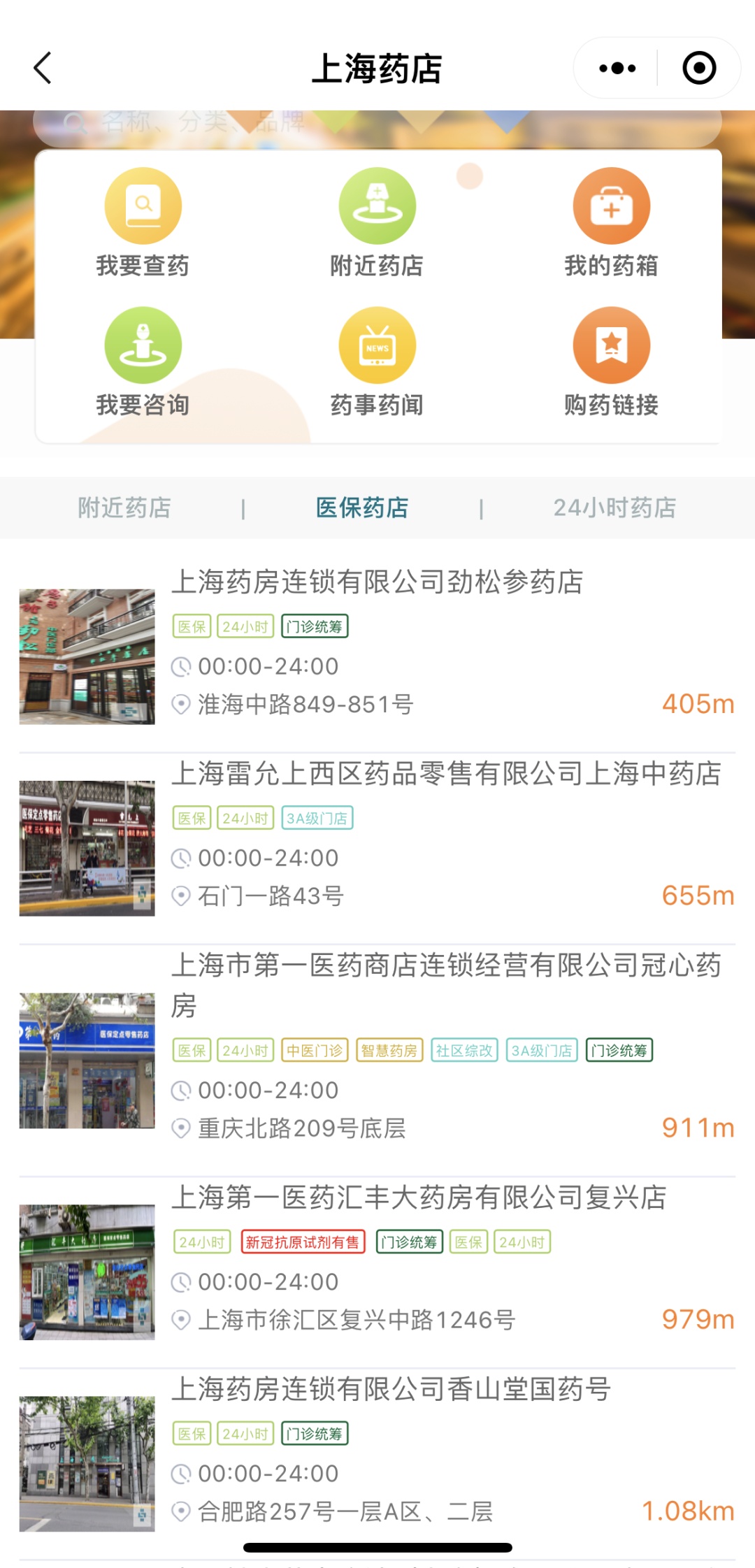 主页下方可按附近药店、医保药店、24小时药店查询附近药店,药店还按实际情况标注有“医保”“门诊统筹”“中医门诊”“智慧药房”“社区综改”等信息。