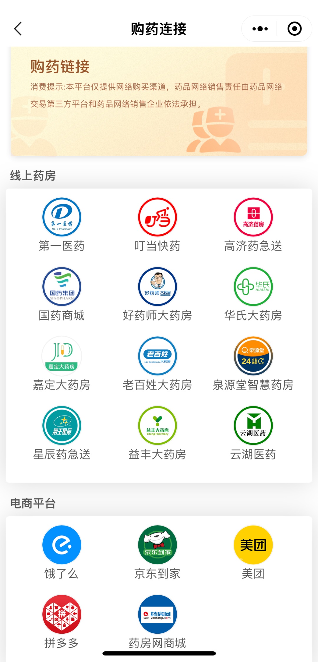 该板块目前上线了12家线上药房和5家电商平台,方便用户足不出户在线购药。