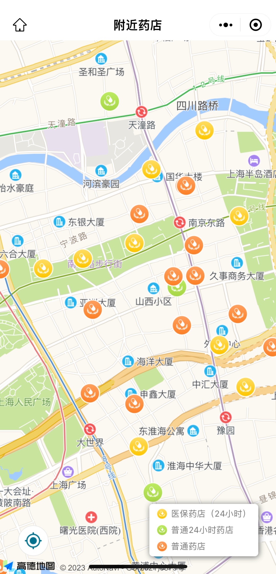 地图样式直观查看附近药店位置,并按黄、绿、橙色分别表示24小时医保药店、普通24小时药店、普通药店。