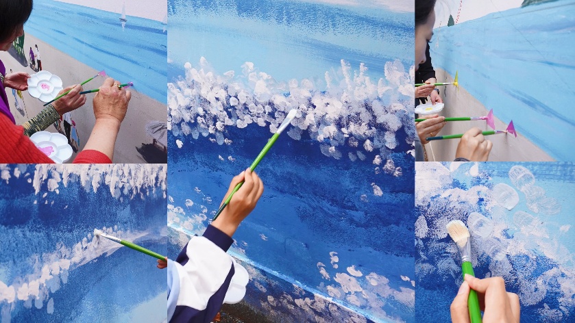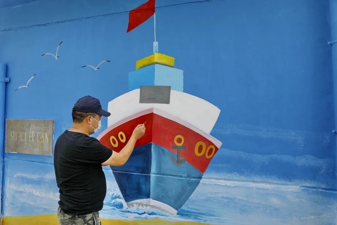 精心绘制着“有花有海”的艺术墙画,