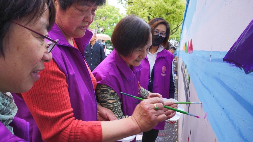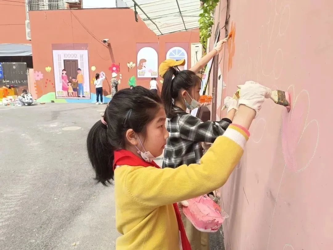 在社区墙体彩绘志愿者等人的绘制下,