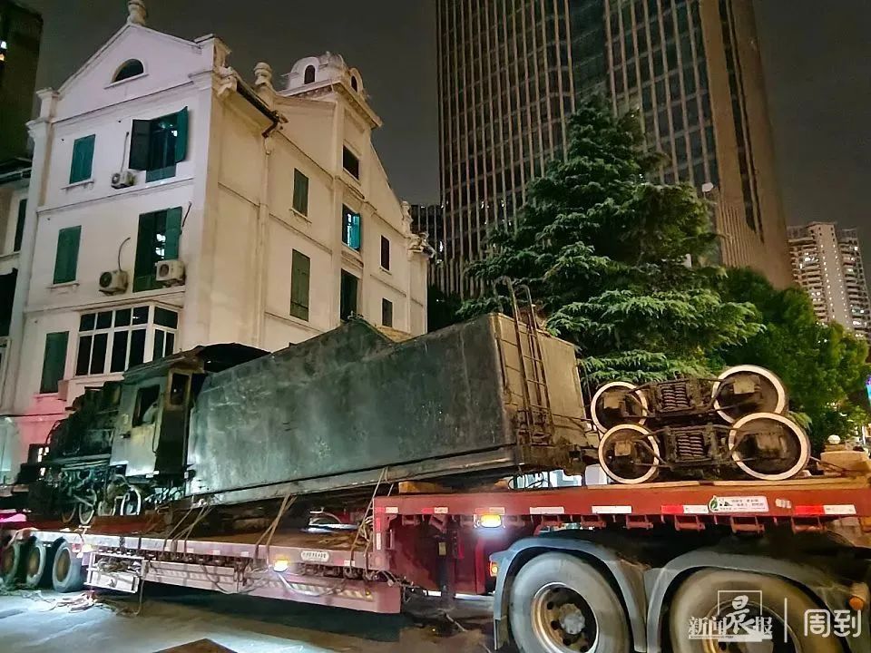 7月19日晚上,记者前往徐家汇采访时,发现火车头已经装上了加长型货车,其中,车轮被堆放在火车头前面。据悉,两节车厢已经分别从花园内被拆除并运走。