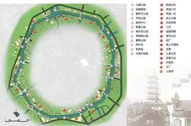 伴随着环城河步道内圈贯通,紫藤园、西大街、儿童公园等丰富的名胜古迹与现代景观串联,水关、古城墙、城河水系与环城绿带连成一体,充满诗意与人文气息,好似一幅申城的“清明上河图”。