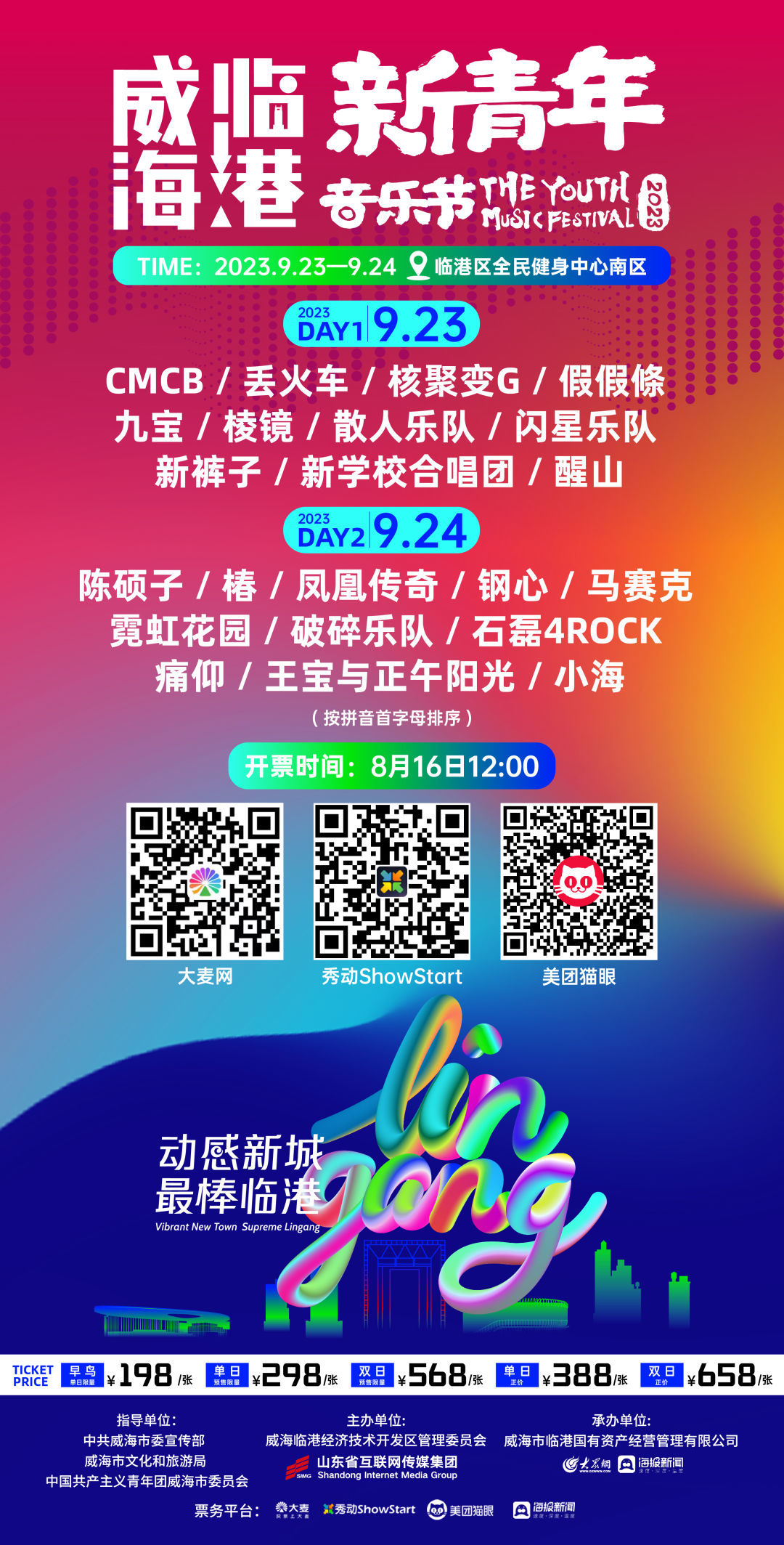 “新青年”是山东省互联网传媒集团潜心打造的音乐ip品牌。十年来,始终保持热爱、坚持态度,让“新青年音乐节”唱响山东“最强音”。每举办一场,都会吸引数万乐迷从全国各地奔赴而来。2023威海临港新青年音乐节门票于8月16日12:00,在大麦网、秀动showstart、美团猫眼、海报新闻同步发售。2023威海临港新青年音乐节预售票价格定为单日¥298,双日¥568。