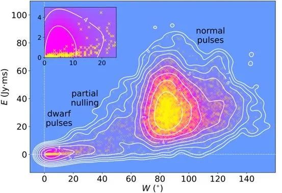 脉冲星b2111+46的矮脉冲在脉冲宽度和辐射能量方面与正常脉冲明显区隔。(中国科学院国家天文台供图)