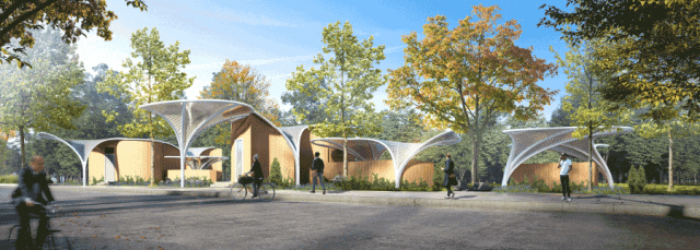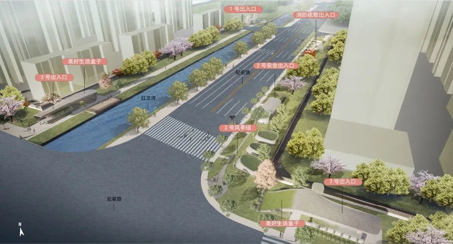 红卫河中间风井为13号线西延伸段纪翟路-金运路区间的中间风井,位于与纪翟路站以东的纪宏路南侧城市绿化带内,周边规划以生态社区、电竞文创功能为主,主要服务于国际高端人群。红卫河中间风井主要涉及一个乘客安全出口、一个消防专用出入口及风井,形成路边“银杏叶”组团。