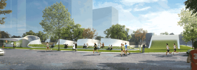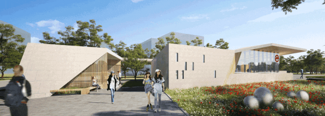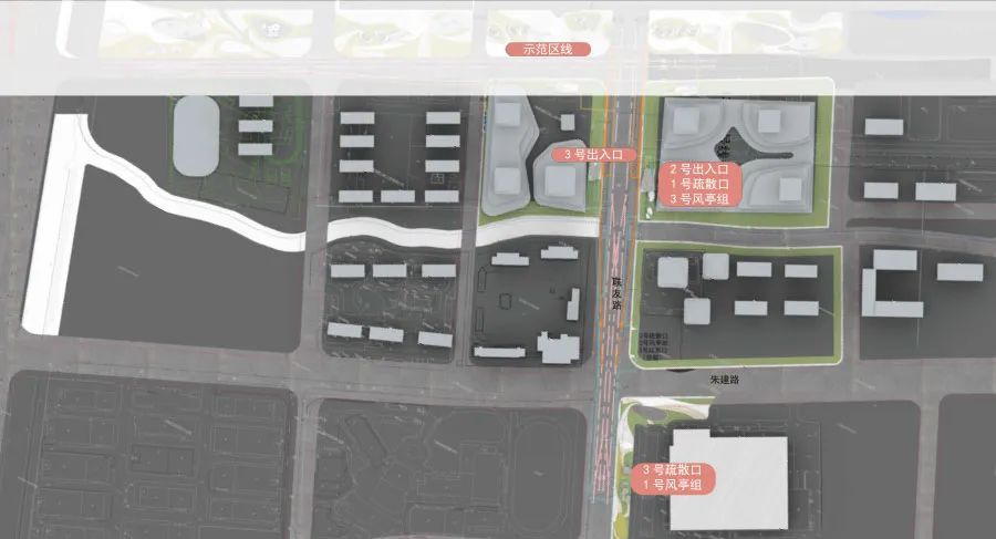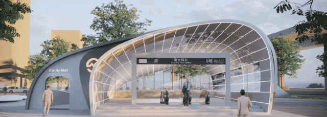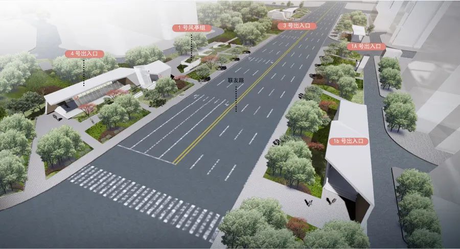 纪翟路站为地下站,设地面出入口3处,街边出入口与低风亭成组团设计,结合绿化景观形成视看马拉松比赛的休憩阶梯平台;河岸出入口与景观岸线一体化设计。