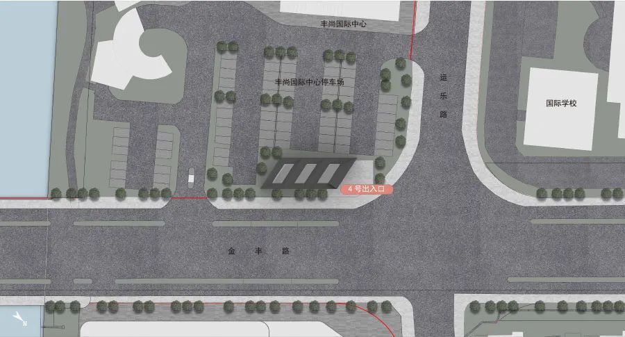 运乐路站位于运乐路与金丰路交叉口,站点周边主要以高端低密度居住及国际学校相关配套为主。本站点定位为国际社区组团站,以宜居生活为主导功能。运乐路站为地下站,设地面出入口4处,其中三处为与其他商业建筑结建,本次设计方案仅涉及4号出入口,与周边居住建筑相融合。