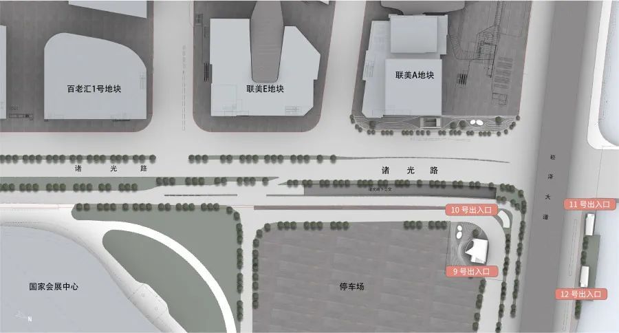 诸光路位于虹桥主城副中心的核心区域,崧泽大道与诸光路交叉口。站点周边主要为商务办公、会展服务等地块,车站与17号线、2号线三线换乘,以疏解国家会展中心在举办大型会展期间的瞬时高峰客流。诸光路站为地下站,设地面出入口12处,出地面设施多与周边规划商办地块结建,改建现状4个单独出入口。