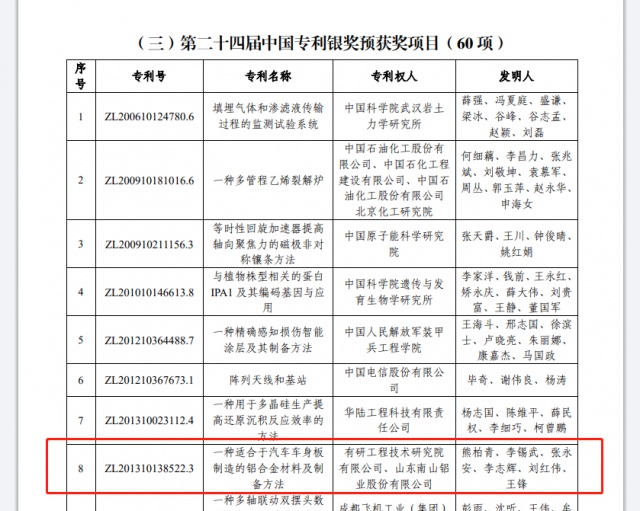 近日,国家知识产权局发布第二十四届中国专利奖授奖决定,我市山东南山铝业股份有限公司“一种适合于汽车车身板制造的铝合金材料及制备方法”(专利号:zl201310138522.3)获中国专利银奖。