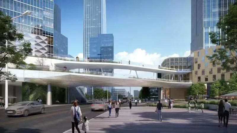 作为北外滩核心区重大工程,空中连廊项目可谓匠心独具、别具一格。空中连廊示范段一期项目实现2022年“当年开工、当年完工”,直接串联友邦金融中心和金茂广场。新开工的二期空中连廊呈东西走向,建成后将连接北外滩来福士至友邦金融中心的二层和三层。这是一段双层曲线型连廊,也是上海首创的双层连廊,其形态呈“飘带”状,将与一期连廊形成一体化的整体效果。