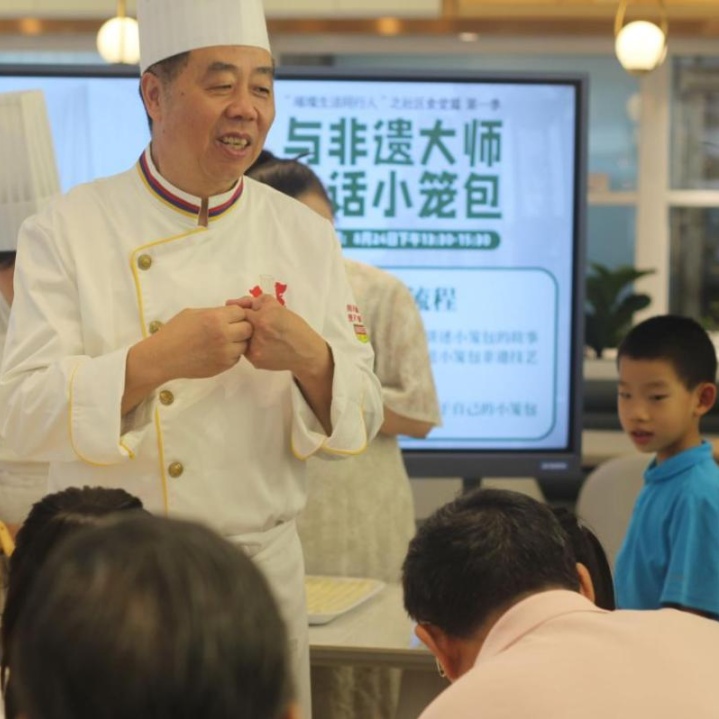 本次活动邀请到第四批国家级非物质文化遗产代表性项目——南翔小笼馒头制作技艺的第六代传承人、中国烹饪大师、上海市工匠、上海市“五一”劳动奖章获得者、中式面点高级技师李建钢,来到现场与社区居民共话小笼包。