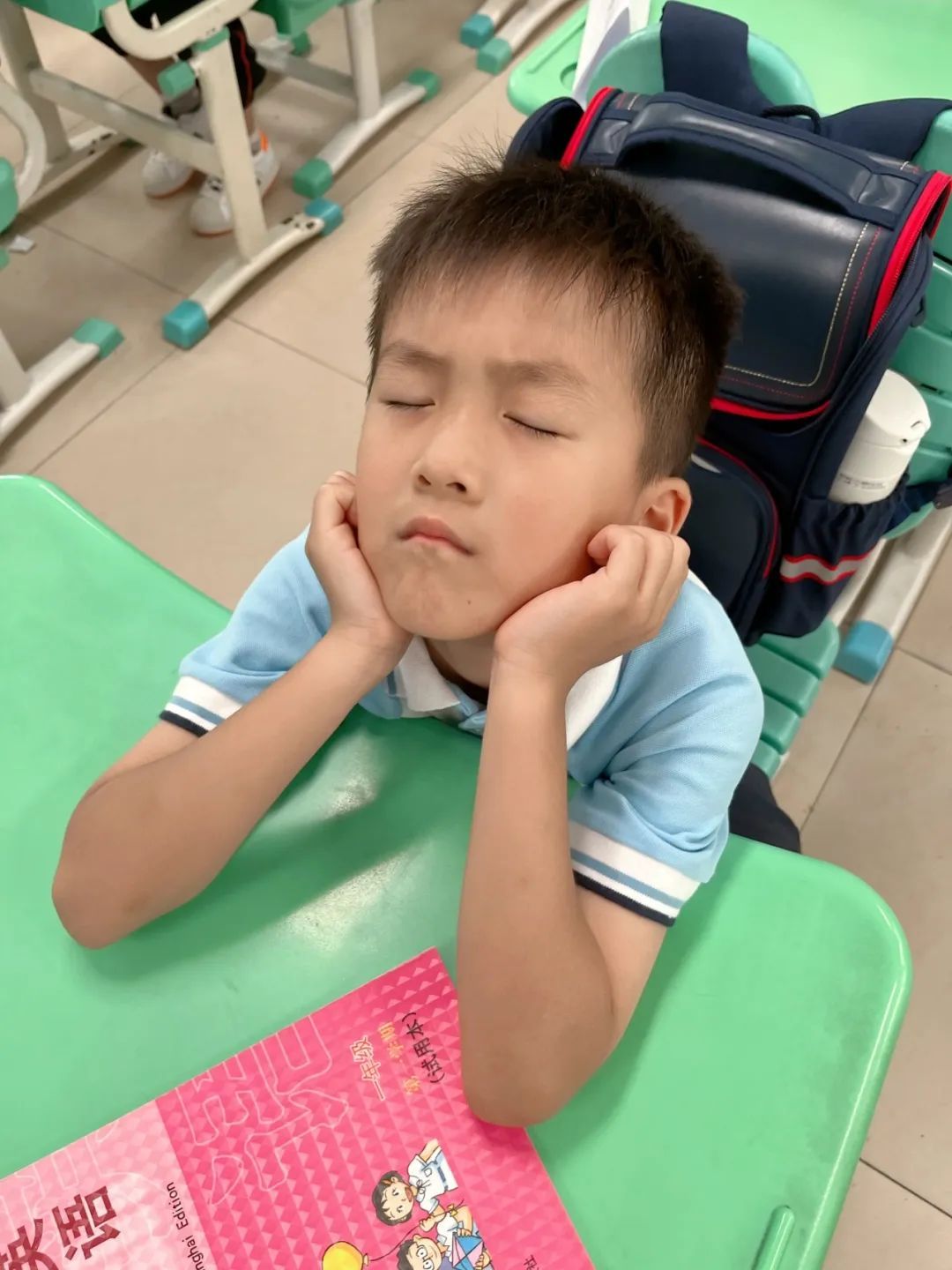 由于小学的中午午休时间比较短,学校会允许孩子们靠着小枕头趴在桌子上休息一会儿。